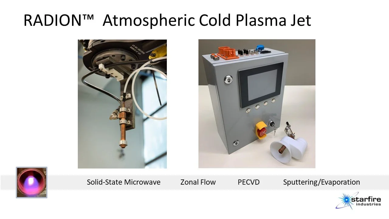 This system is being used for direct plasma cleaning, surface functionalization, graded material coating for corrosion-resistance and adhesion promotion, and reactive activation and surface sealing. The RADION was successfully used for point-of-manufacturing treatment of dissimilar materials prior to adhesive bonding between Mg, Al, CFRP, stainless-steel and other composite materials.